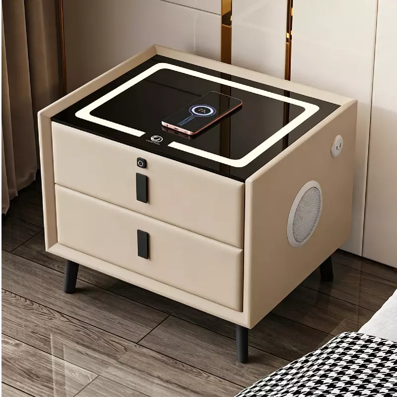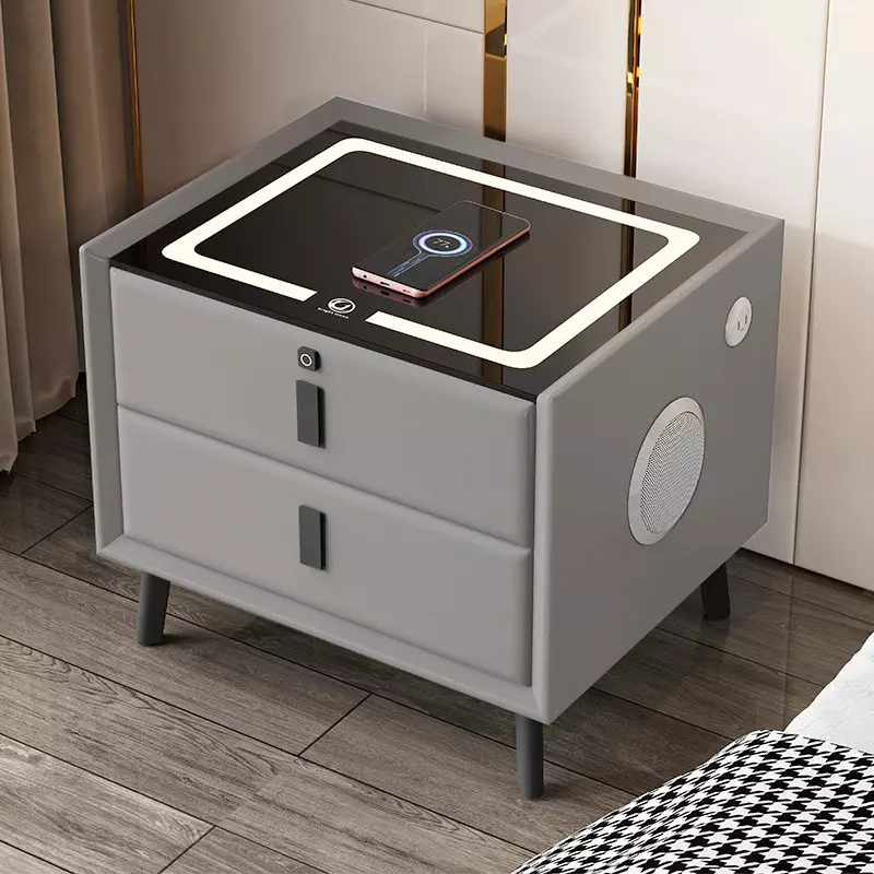 Modern 2-Drawer Smart Nightstand with Wireless Charging, Bluetooth Speaker, LED Ambient Light & Fingerprint Lock - Glass Top Smart Bedside Table for Bedroom