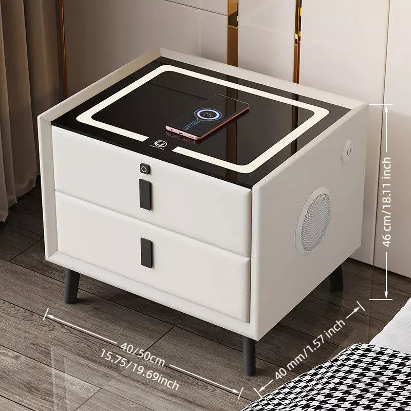 Modern 2-Drawer Smart Nightstand with Wireless Charging, Bluetooth Speaker, LED Ambient Light & Fingerprint Lock - Glass Top Smart Bedside Table for Bedroom